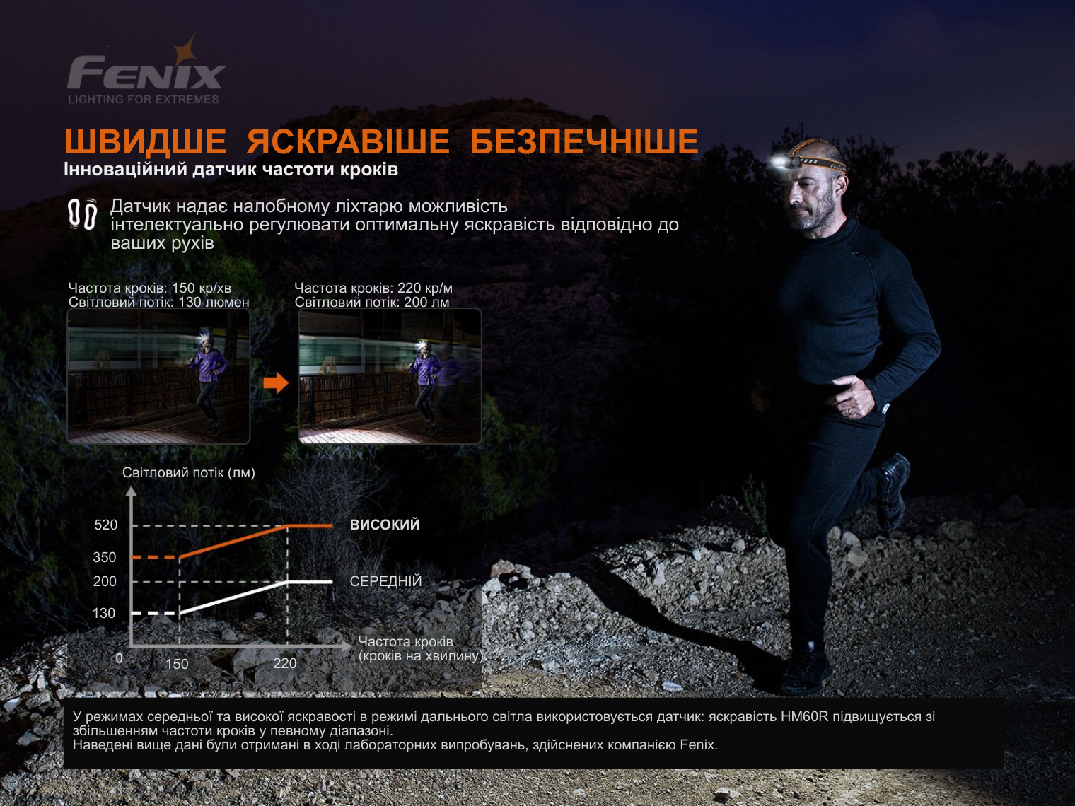 Унікальною фішкою моделі є інтелектуальний сенсор частоти кроку. Ліхтар автоматично регулює яскравість залежно від темпу вашого руху в «Середньому» та «Максимальному» режимах. За стандарт взято темп 150 кроків/хв: при прискоренні до 220 кр/хв яскравість зростає до 150%, а при уповільненні до 80 кр/хв — знижується до 70%. Якщо темп падає, яскравість зменшується поступово з затримкою в 10 секунд, що дозволяє очам адаптуватися до зміни світла.