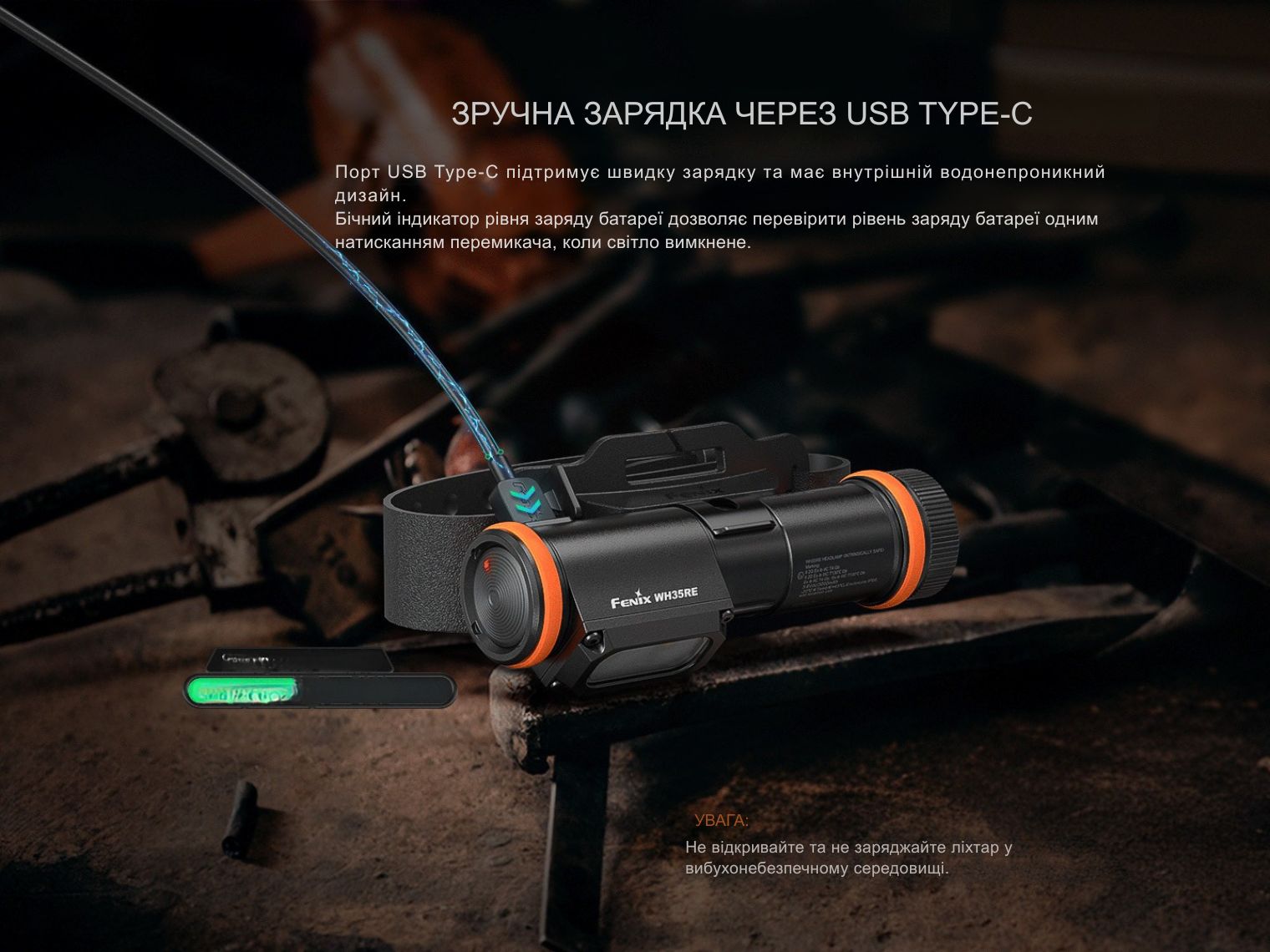WH35RE живиться від спеціального вибухозахищеного Li-ion акумулятора Fenix ARB-L21-3000Ex формфактора 21700 (3000 мАгод) з комплекту. Заряджання здійснюється через порт USB-C з внутрішнім вологозахистом. Для дотримання вимог безпеки під час заряджання необхідно використовувати комплектний адаптер.