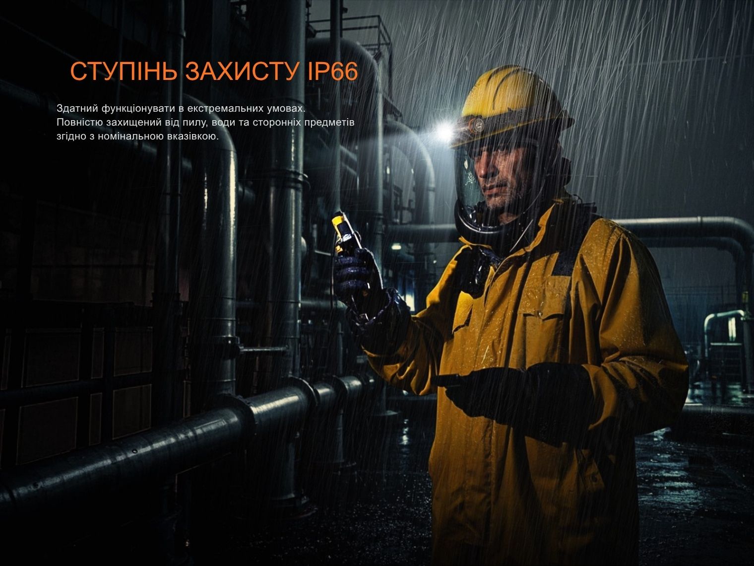 Корпус виконаний з алюмінієвого сплаву A6061-T6 з твердим анодуванням, що підвищує стійкість до корозії та механічних пошкоджень при падінні з висоти 2 м. Клас захисту від води та пилу IP66 передбачає експлуатацію у складних умовах, включно з підвищеною вологістю.