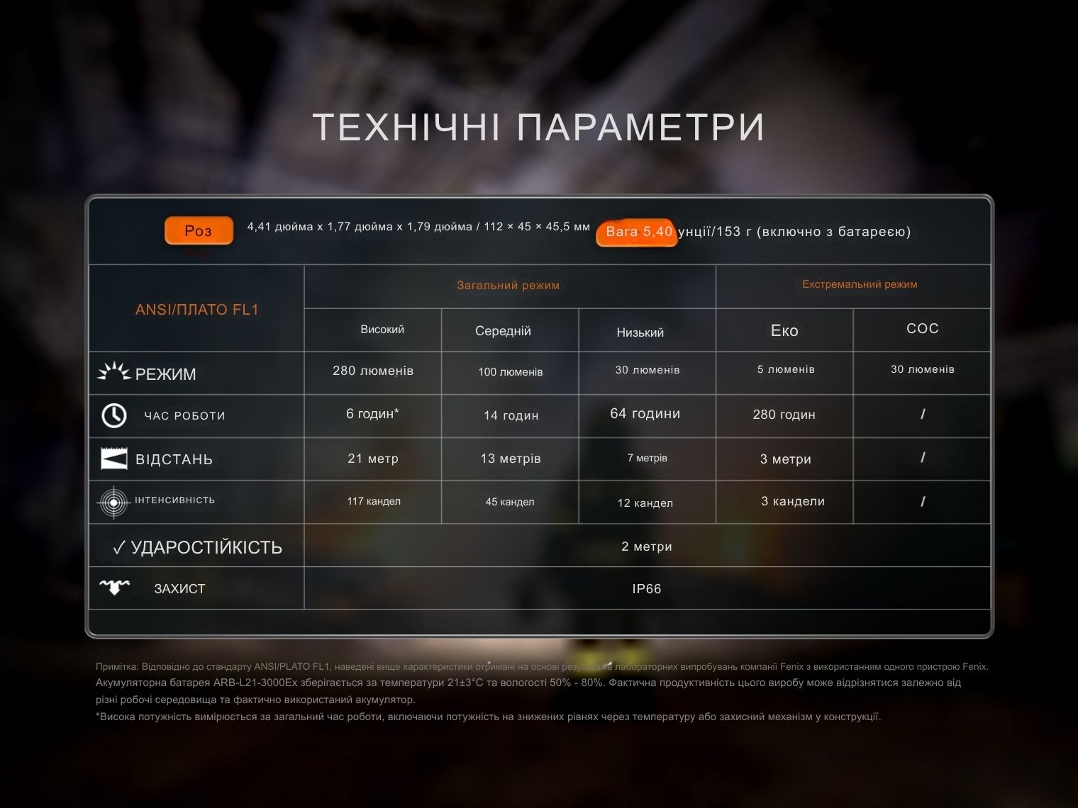 Зверніть увагу! У ліхтарі Fenix WH35RE є захист від перегрівання. Час роботи в режимі Високий розрахований в сумі з часом роботи на нижчій потужності, на яку система автоматично перемикається у разі надмірного нагрівання електроніки.