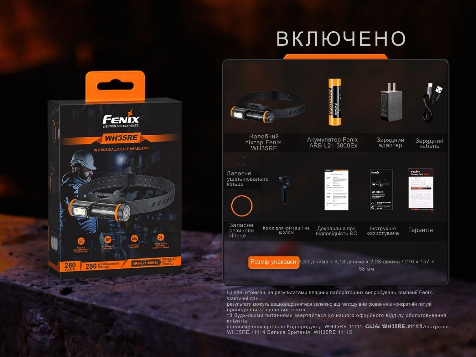 Ліхтар Fenix WH35RE, акумулятор ARB-L21-3000Ex (21700), зарядний USB-C кабель, адаптер для заряджання, антистатичне оголов'я з кріпленням, запасні ущільнювальні кільця, інструкція користувача, гарантійний талон.