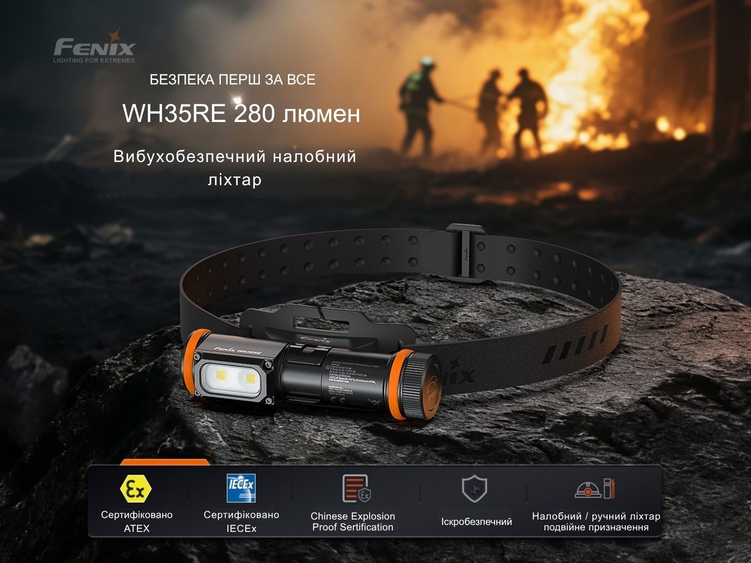 Налобний ліхтар Fenix WH35RE з вибухозахищеною конструкцією призначений для роботи в зонах з ризиком вибуху газів та пилоповітряних сумішей на об'єктах нафтохімії, енергетики, металургії, целюлозно-паперової та текстильної промисловості. Модель сертифікована за стандартами IECEx, ATEX та GRGT.
