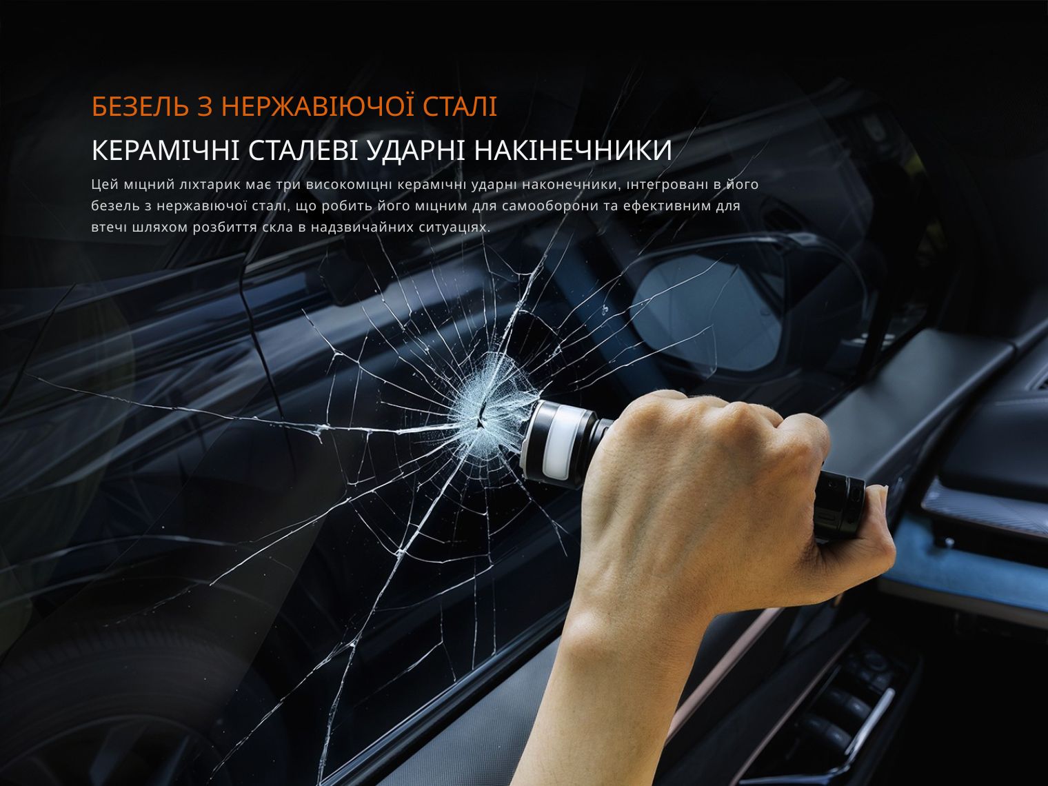 Корпус виготовлений з антикорозійного сплаву алюмінію A6061-T6 та доповнений сталевим безелем з керамічними наконечниками для розбивання скла та захисту під час самооборони. Глибокі ребра під головою конструкції відповідають за відведення накопиченого електронікою тепла. Дрібна накатка на руківʼї перешкоджає ковзанню у долоні.