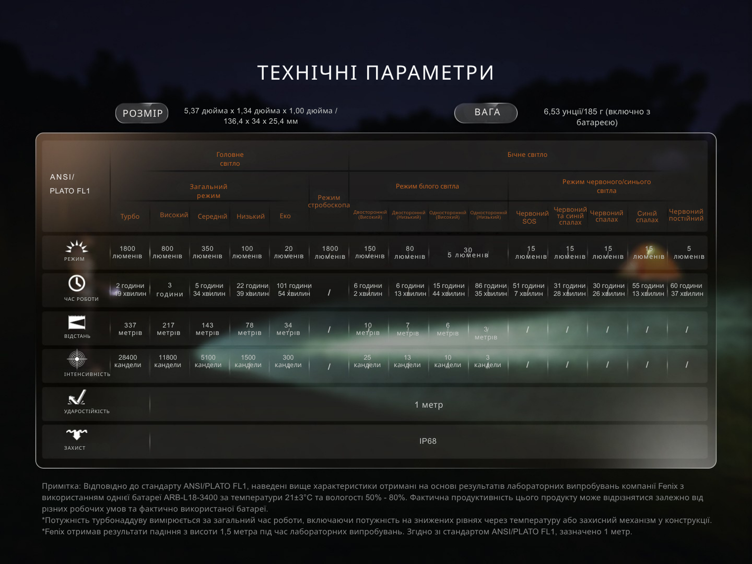 Зверніть увагу! Дані про час роботи в режимі Турбо вказані з урахуванням часу роботи в режимах нижчої яскравості. Ліхтар автоматично знижує потужність, коли спрацьовує захист від перегрівання.
