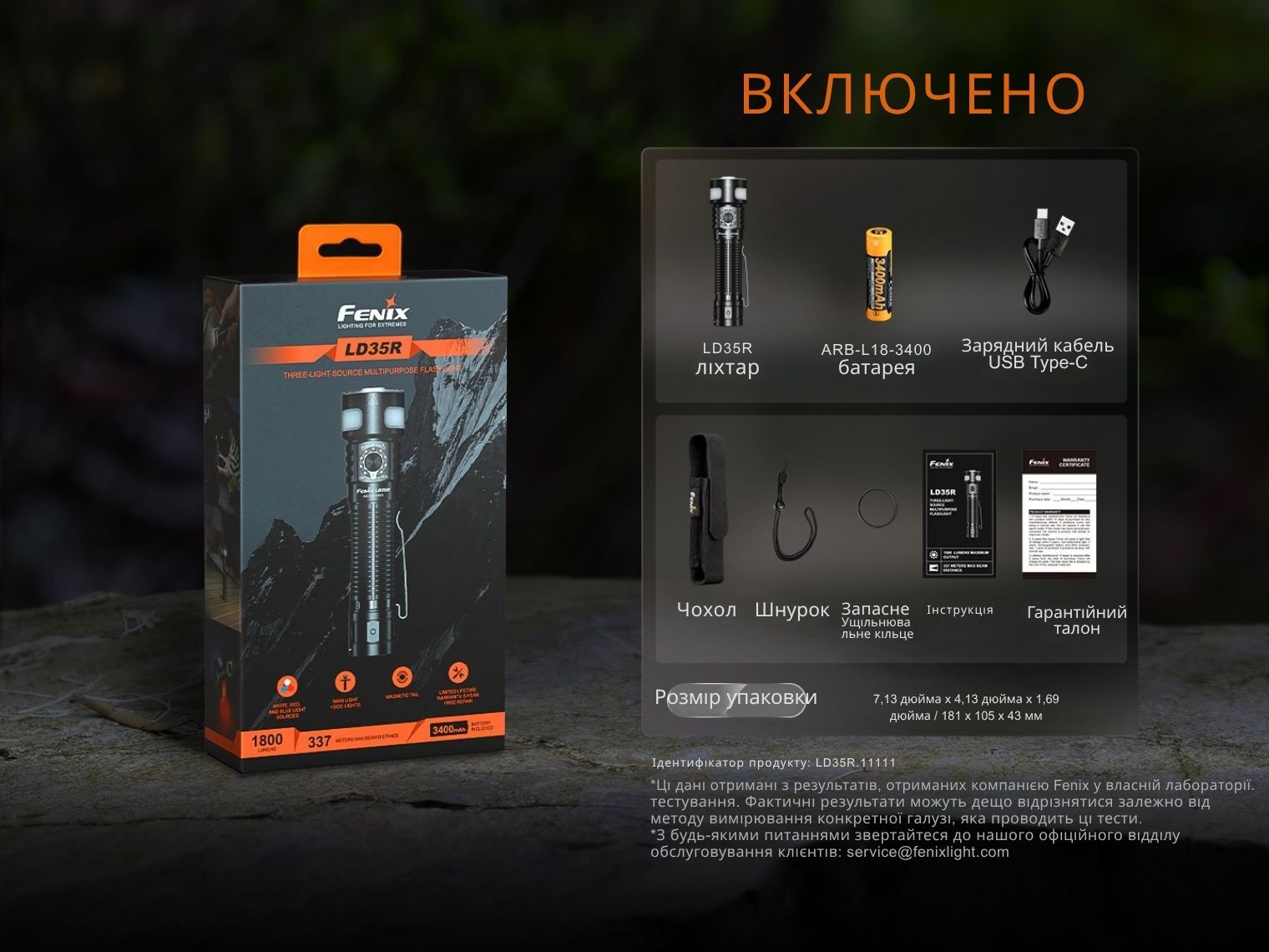 Ліхтар Fenix LD35R, акумулятор ARB-L18-3400, кабель USB-C для заряджання, запасне ущільнювальне кільце, темляк, чохол на пояс, інструкція користувача, гарантійний талон.