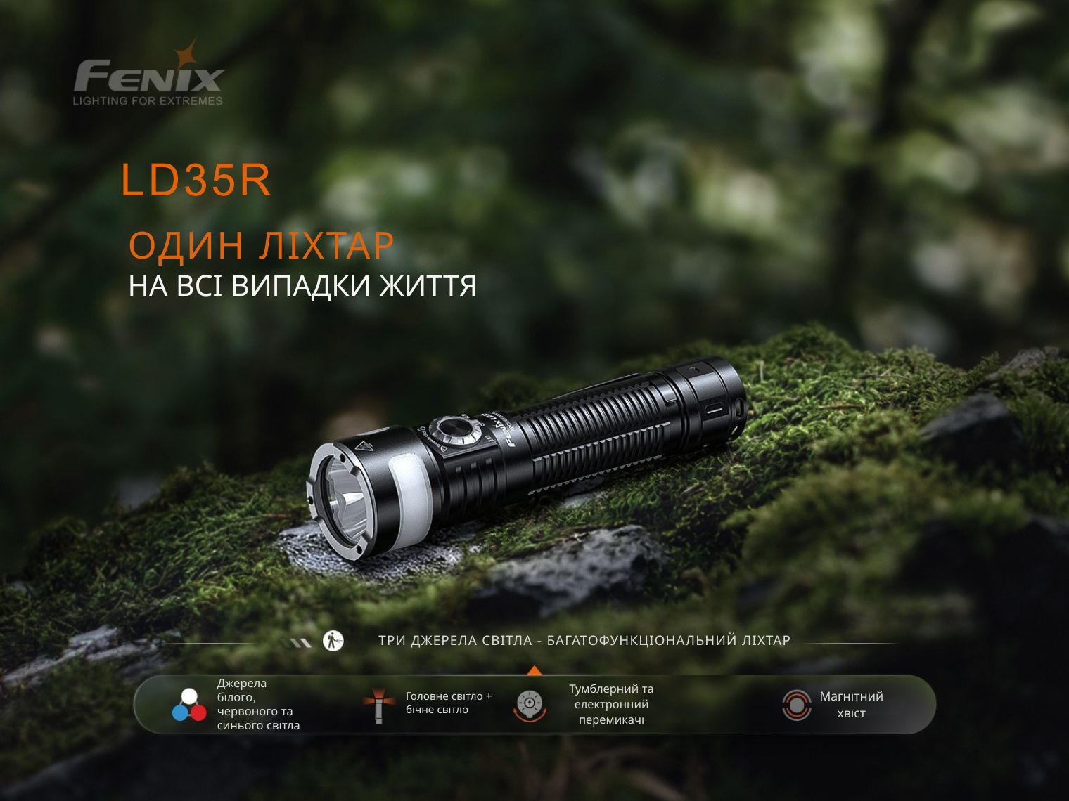 Ліхтар Fenix LD35R може генерувати не лише спрямоване вперед біле світло яскравістю до 1800 люменів, але й м'яке бічне підсвічування у 3 відтінках (біле, червоне, синє). Інтерфейс складається з 15 режимів. Живлення від акумулятора 18650 з можливістю заряджання прямо в корпусі ліхтаря через порт USB-C. Герметичний корпус із алюмінію доповнений сталевим безелем з керамічними наконечниками, магнітом у хвості та знімною кліпсою.