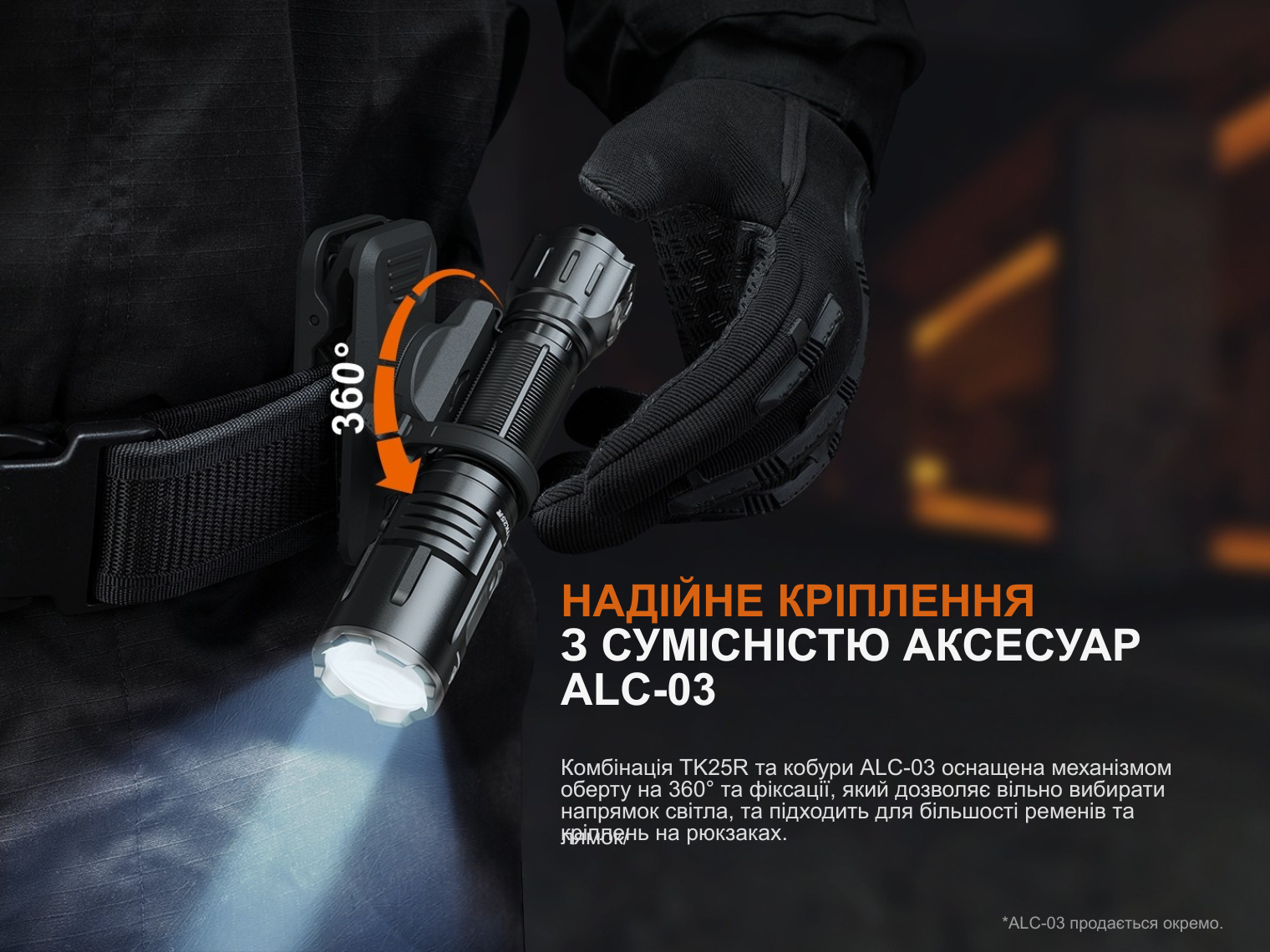 Fenix TK25R сумісний з тактичними аксесуарами: виносними кнопками (наприклад, серії AER), кріпленнями на зброю серії ALG та світлофільтрами відповідного діаметру.