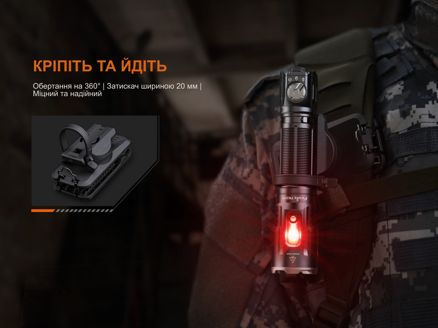 У комплекті передбачена знімна сталева кліпса для надійної фіксації на одязі або спорядженні.