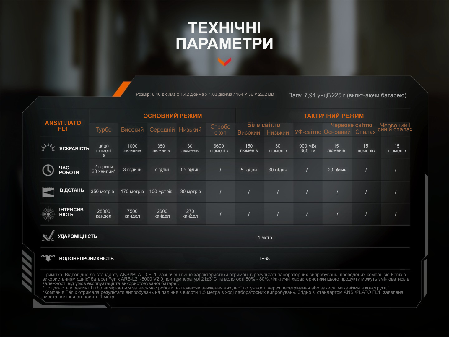 - Турбо: 3600 лм – 31100 кд – 2 год – 350 м;