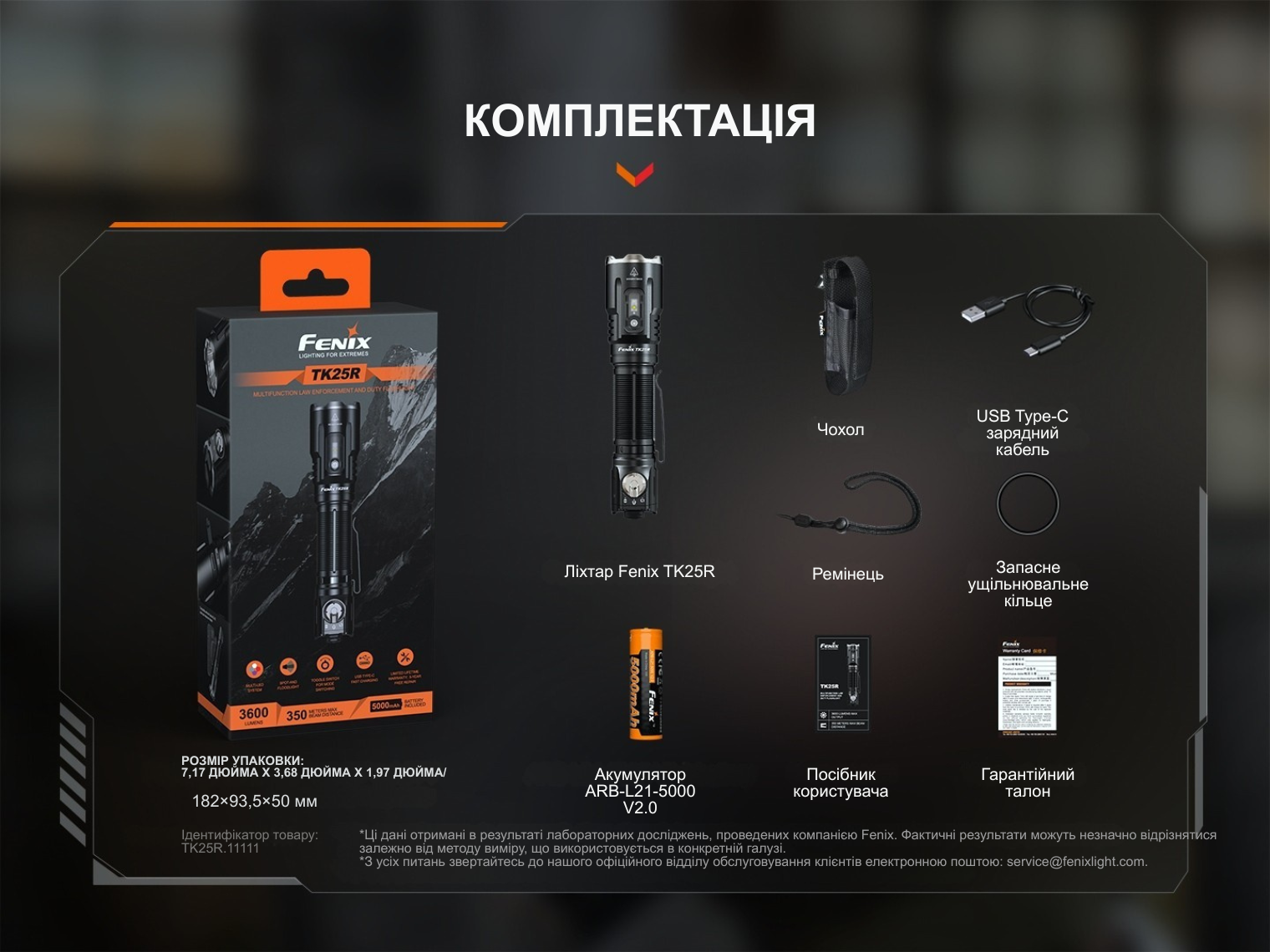 Ліхтар Fenix TK25R, акумулятор ARB-L21-5000 V2.0, зарядний кабель USB Type-C, кобура (чохол), темляк, запасне ущільнювальне кільце, інструкція користувача, гарантійний талон.