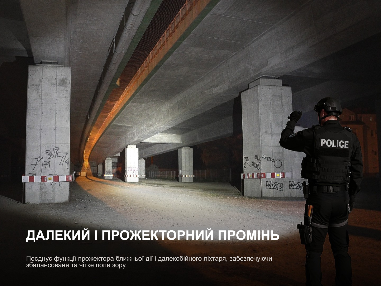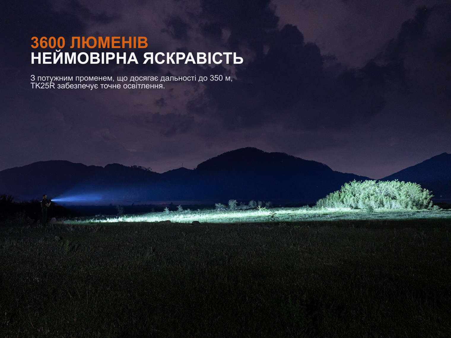 Потужний промінь на 3600 люменів освітлює до 350 м дистанції, створюючи широкий світловий потік для контролю великих територій.