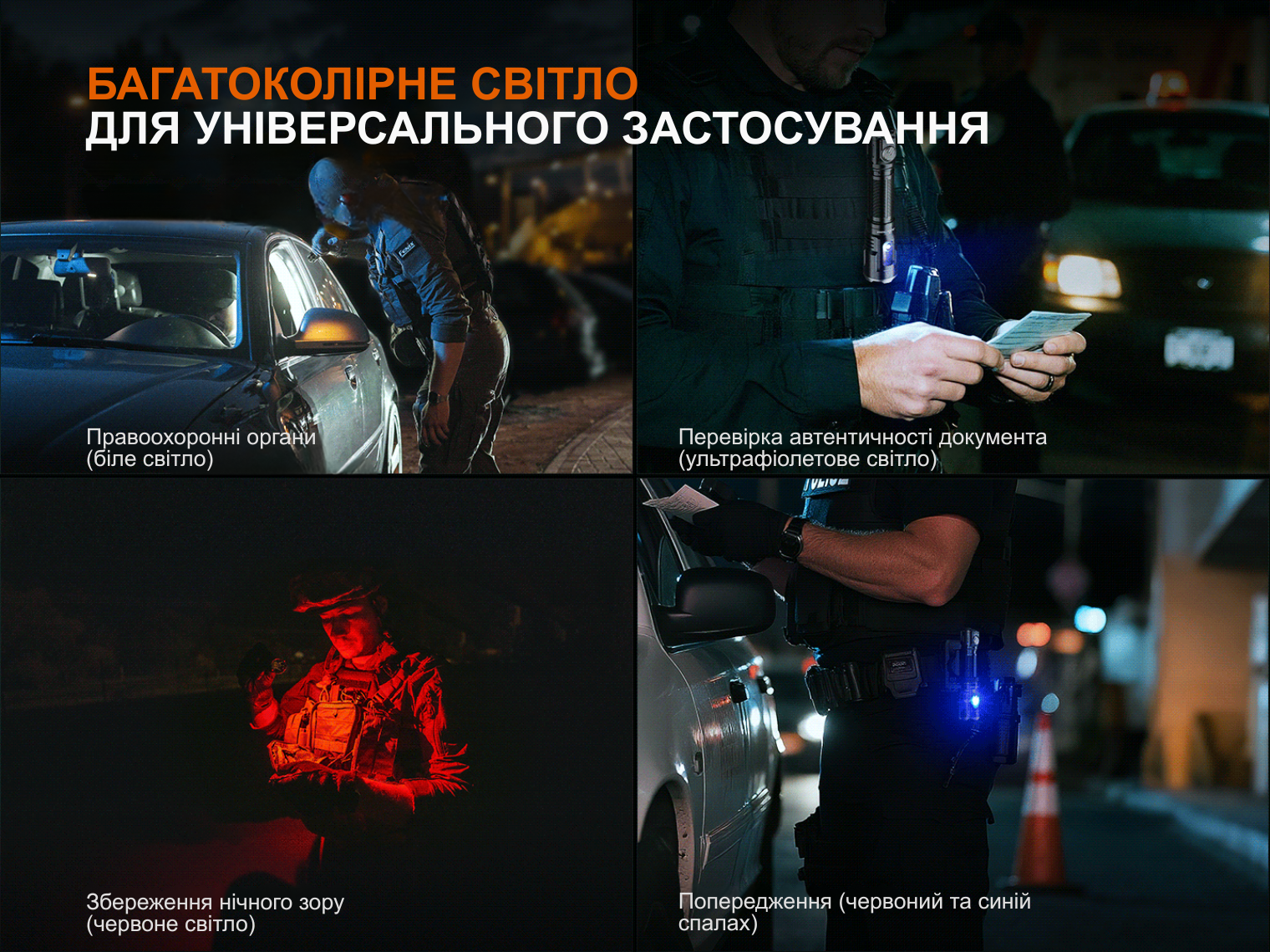 Ключова особливість — універсальна оптична система. Окрім основного світла, ліхтар має бічну панель у голові з розсіяним білим світлом, УФ-випромінюванням (UV), червоним світлом та синьо-червоними сигнальними маячками.