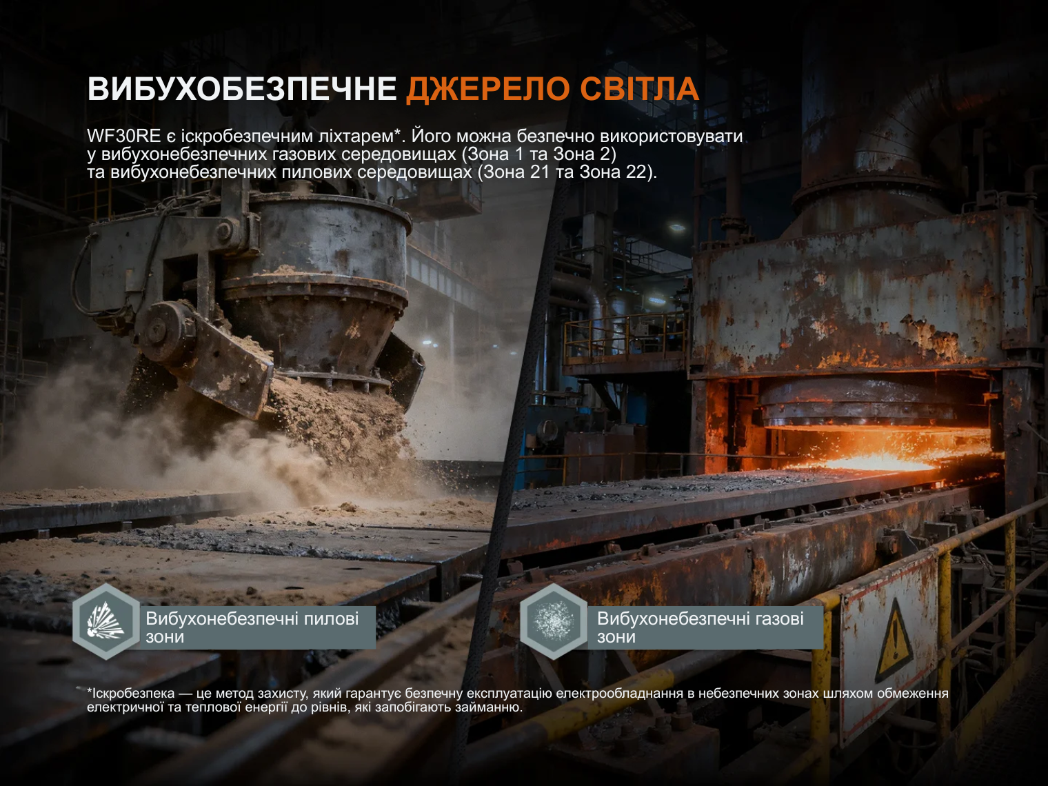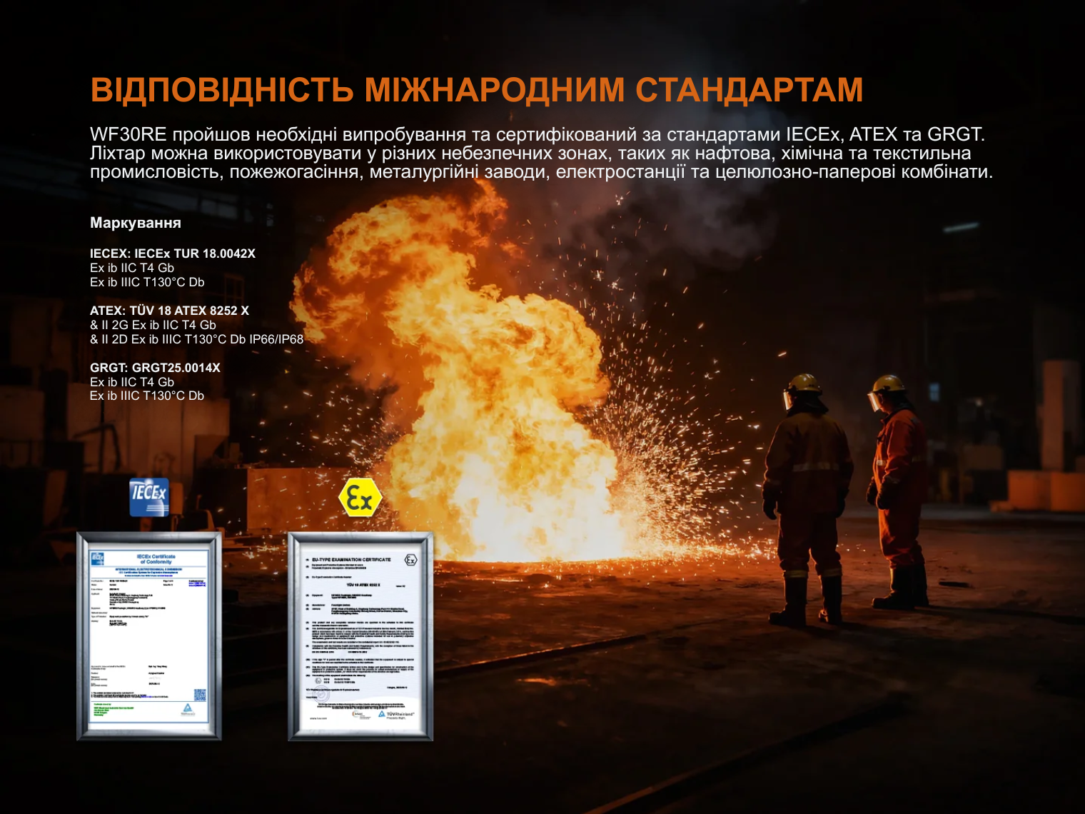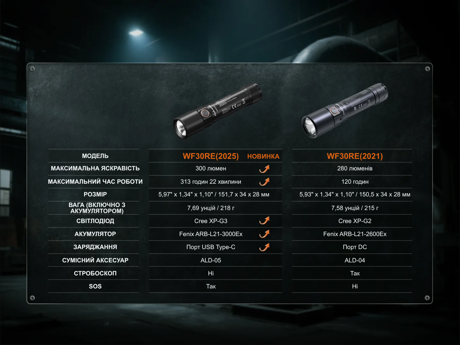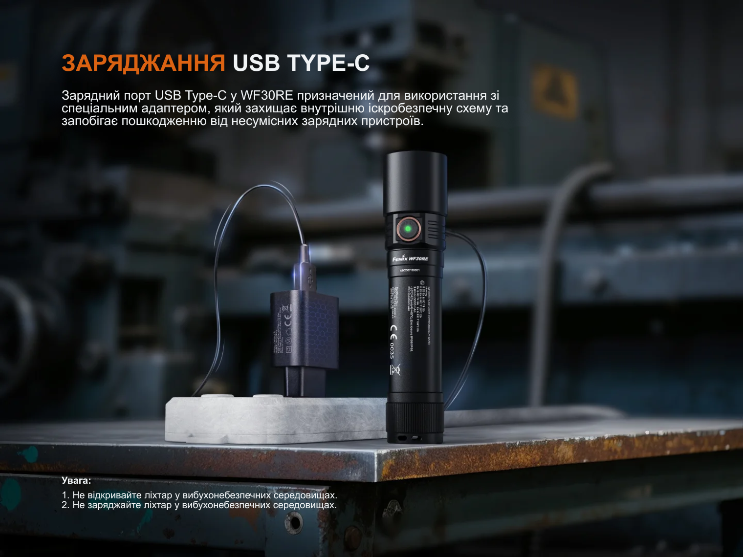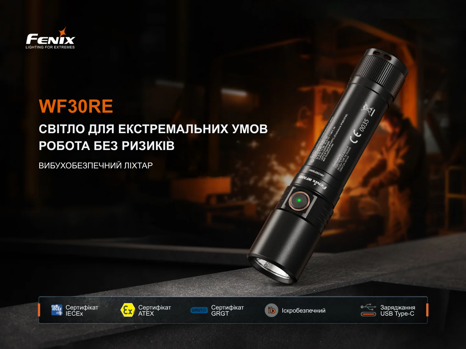 Fenix WF30RE Spark генерує світло 300 лм із дальністю променя 149 м завдяки діоду Cree XP-G3. Оновлена версія отримала рекордний час роботи до 313 год 22 хв та акумулятор збільшеної ємності ARB-L21-3000Ex. Ліхтар сертифікований за стандартами IECEx, ATEX та GRGT для безпечної роботи у вибухонебезпечних зонах 1, 2, 21 та 22. Заряджання через вбудований порт USB Type-C.