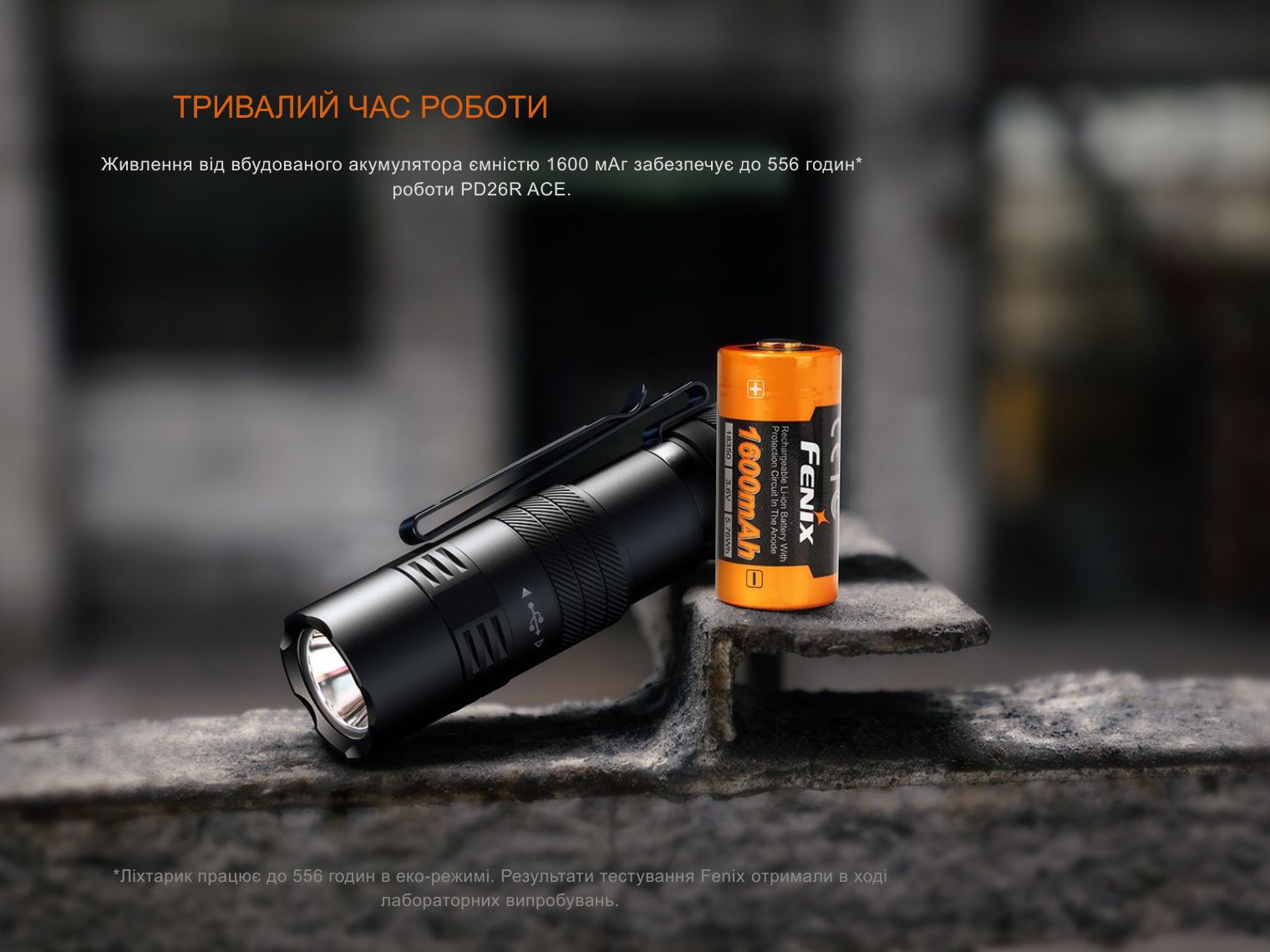 Fenix PD26R ACE живиться від одного літій-іонного акумулятора 18350 ємністю 1600 мАгод, що входить до комплекту. Заряджання здійснюється через прихований порт USB-C, захищений від вологи та пилу.