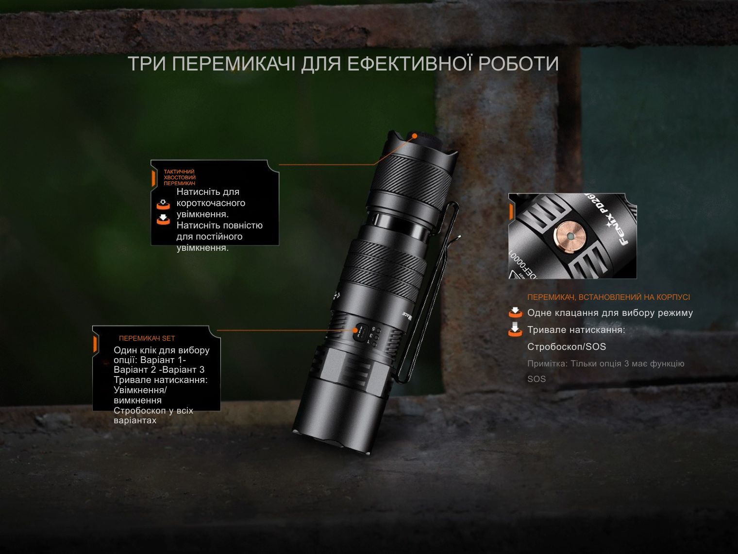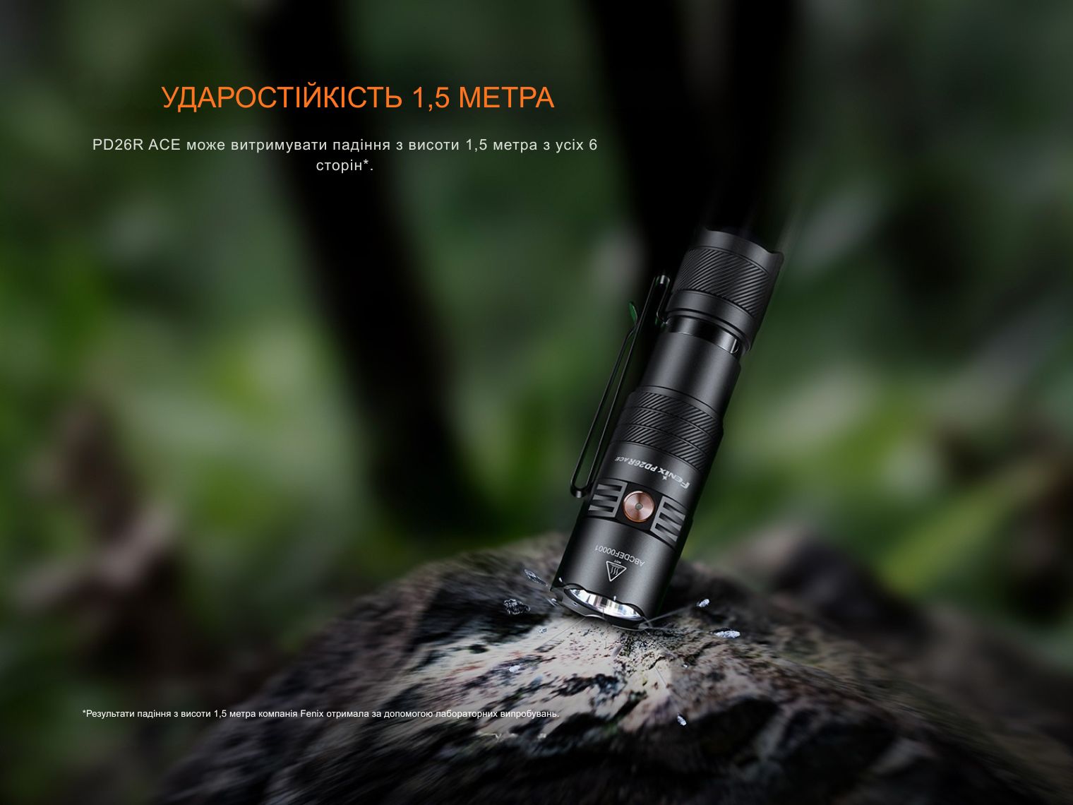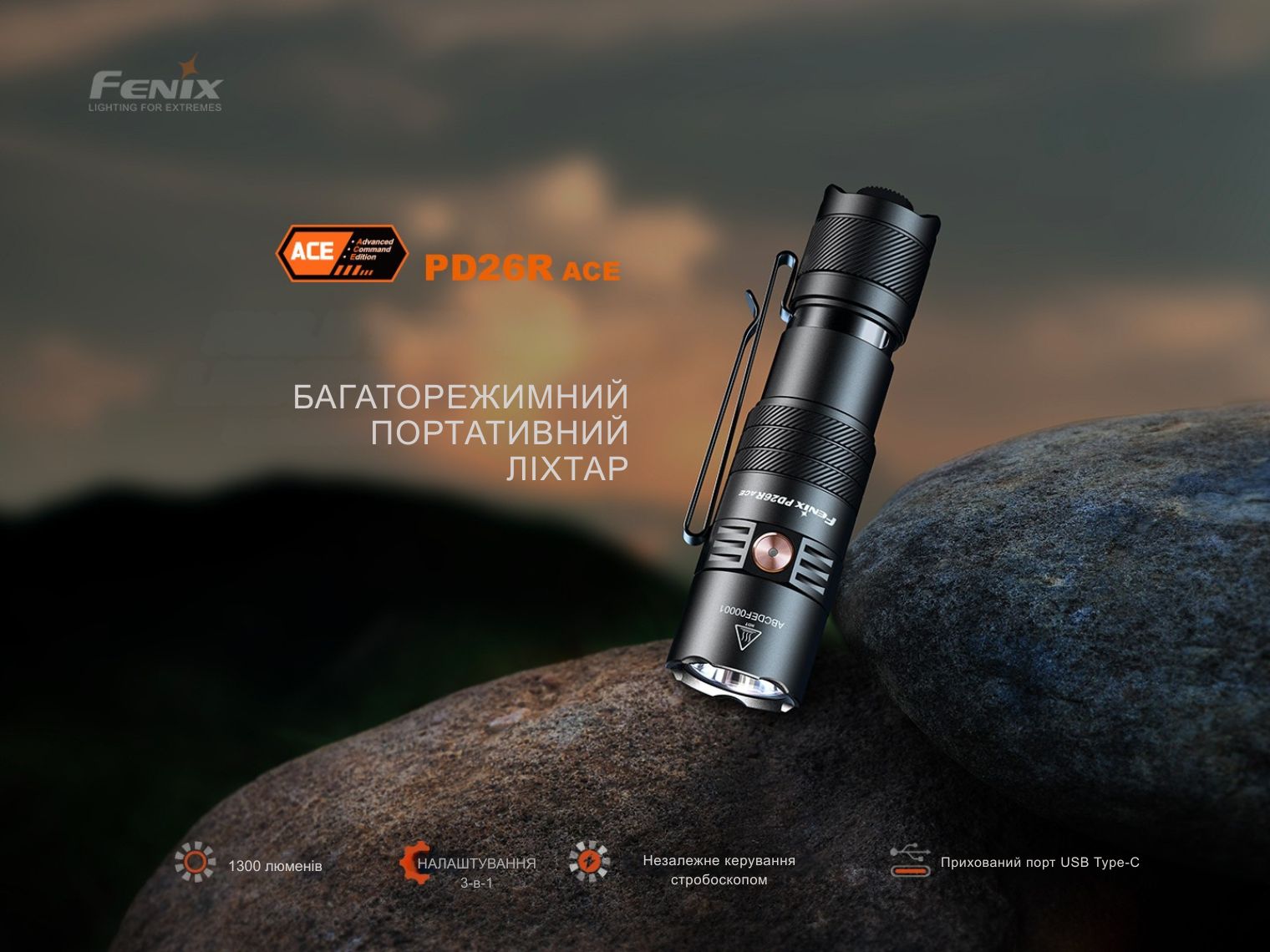 Ліхтар Fenix PD26R ACE для тактики генерує світло яскравістю 1300 лм з дальністю променя 354 м. Керування трьома кнопками, включно з ексклюзивним перемикачем SET для гнучкого налаштування набору режимів. Усього 7 варіантів освітлення. Живлення від комплектного акумулятора 18350 на 1600 мАгод із зарядним портом USB-C. Корпус з алюмінію A6061-T6 захищений за стандартом IP68 та доповнений знімною кліпсою.