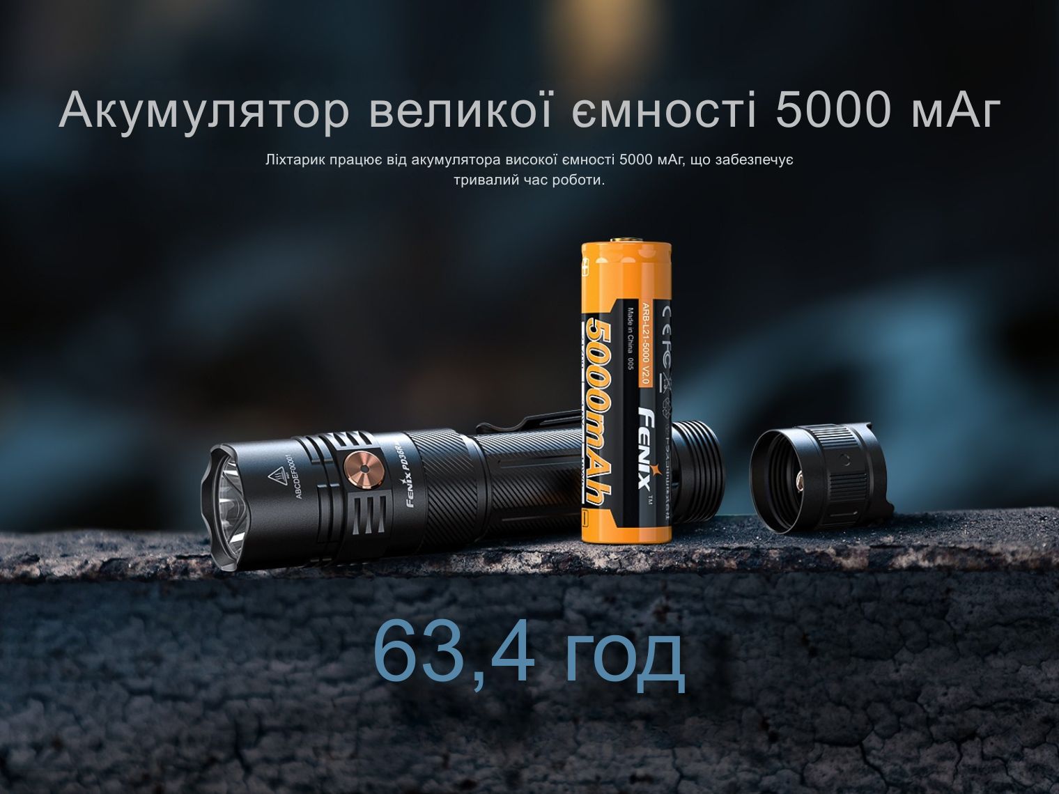 Ліхтар працює від одного Li-ion акумулятора 21700. Цей елемент постачається в комплекті — фірмовий Fenix ARB-L21-5000 V2.0 (5000 мАгод).