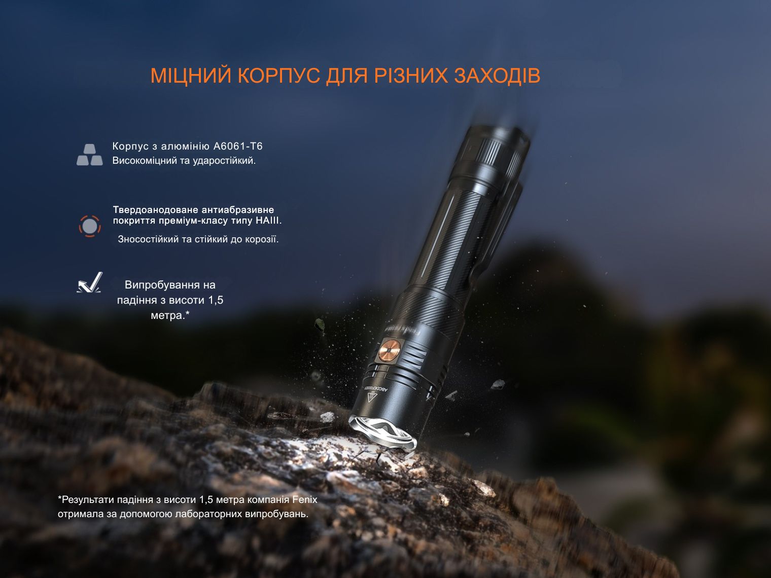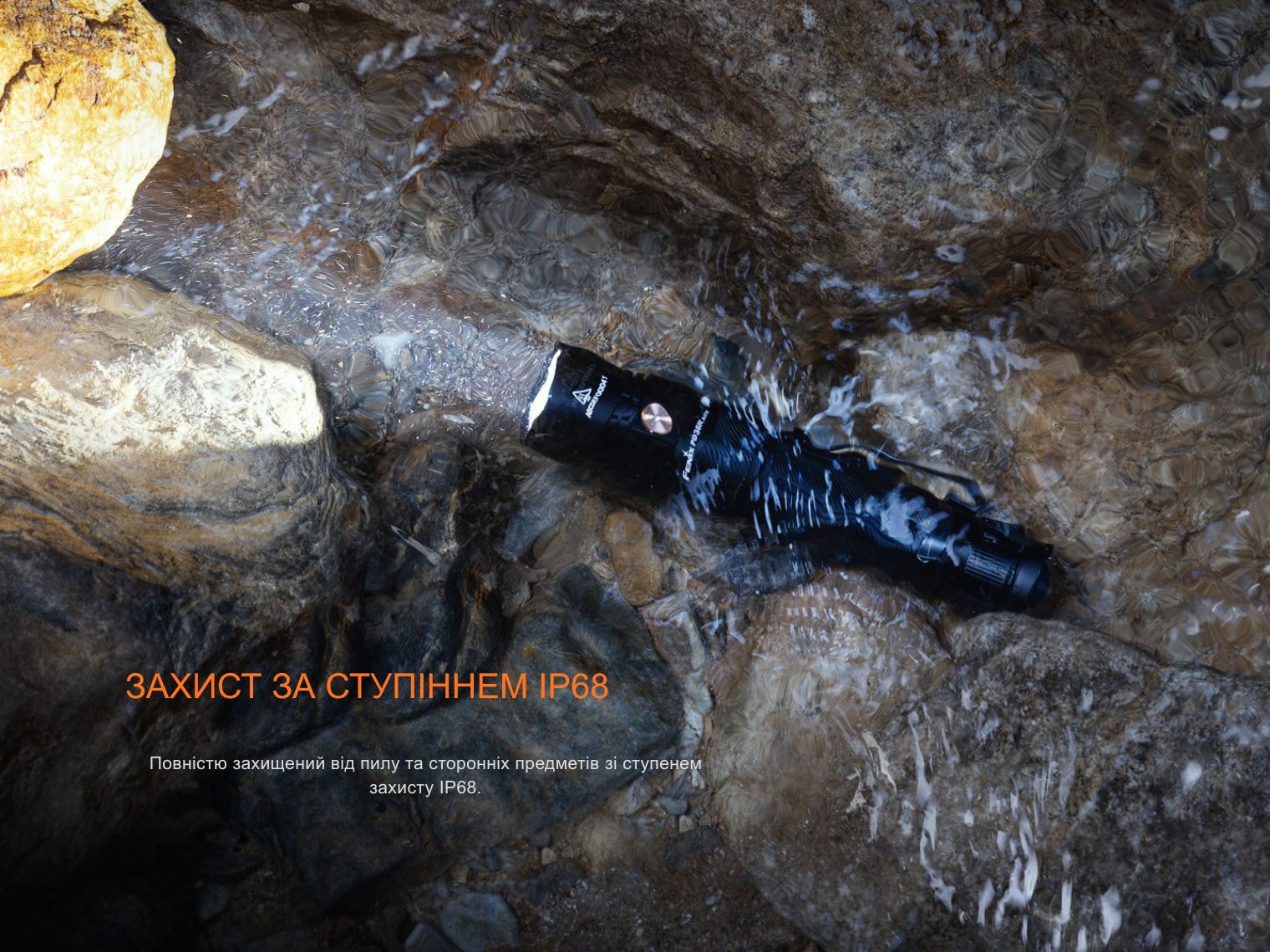 Конструкція герметична відповідно до найвищого захисного класу IP68, який гарантує роботу ліхтаря навіть при зануренні у воду на 2-метрову глибину. Удароміцність сягає 1 м.