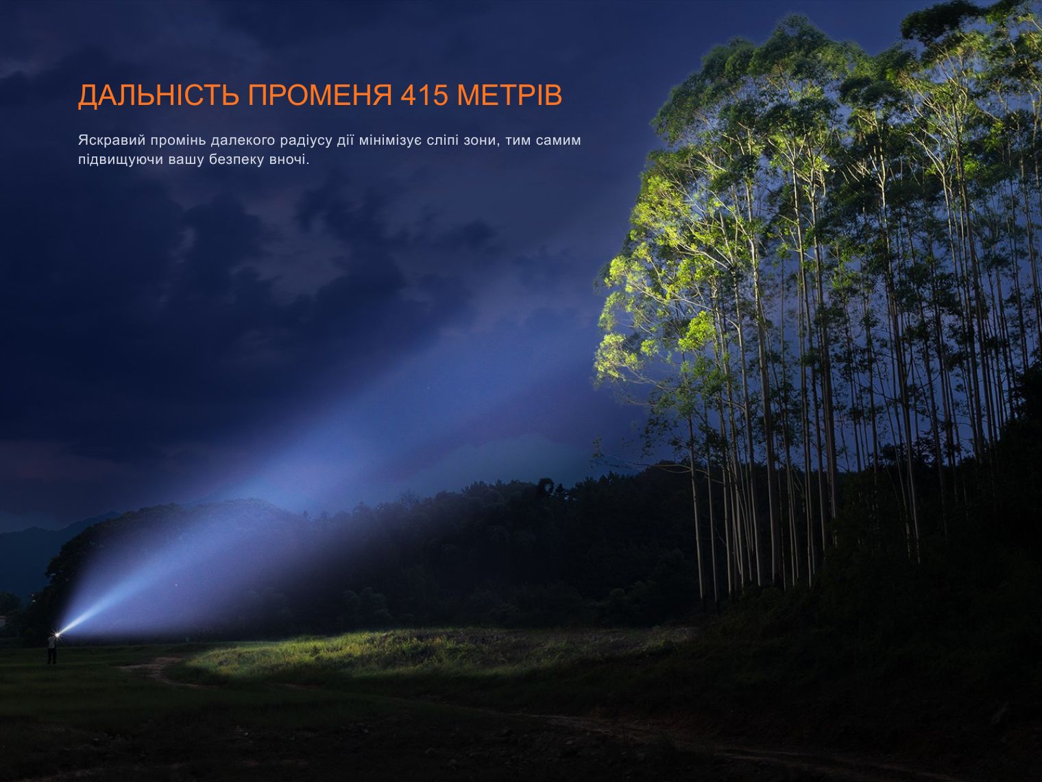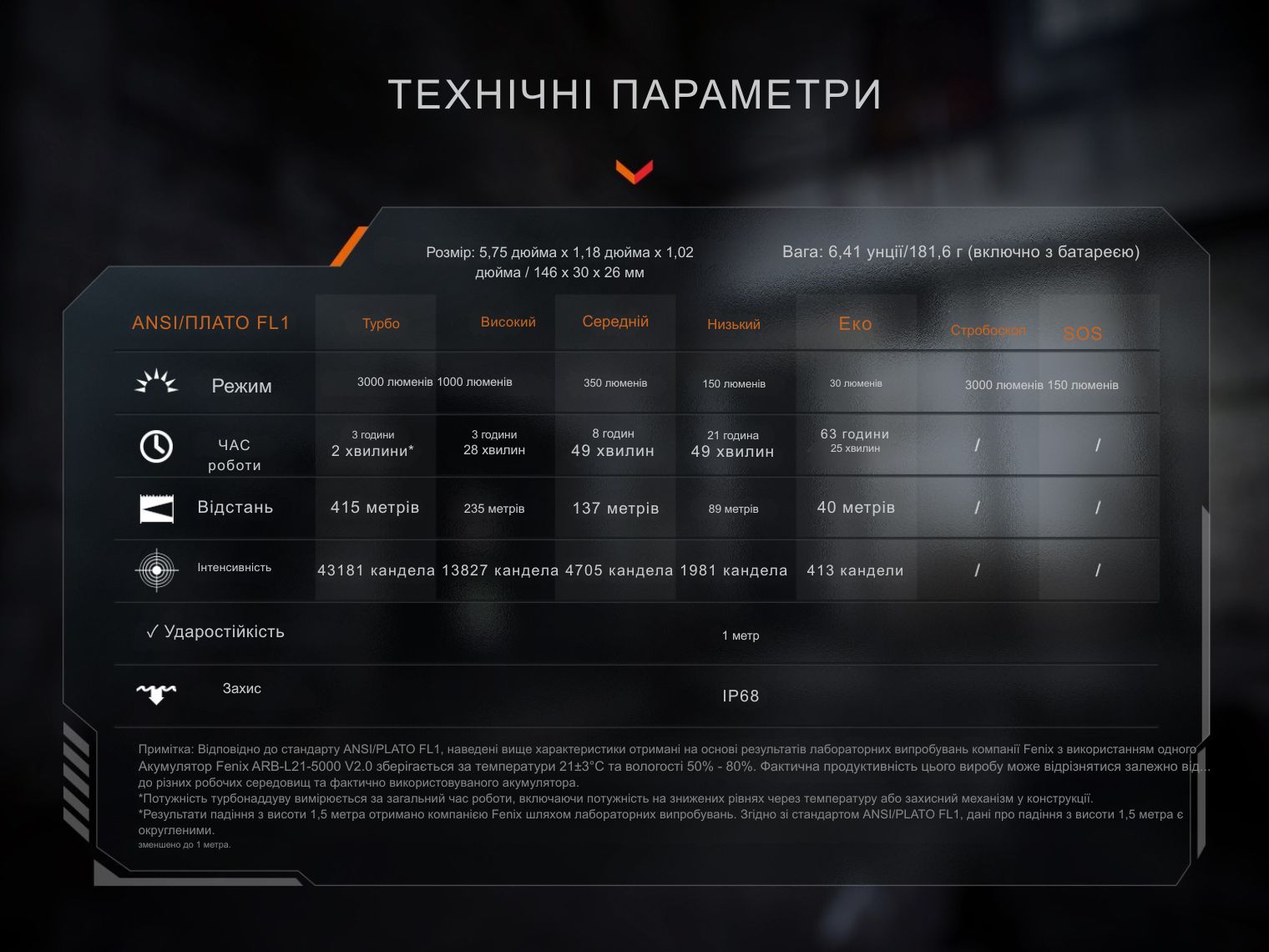 - Турбо: 3000 лм – 43 181 кд – 3 год 2 хв – 415 м;