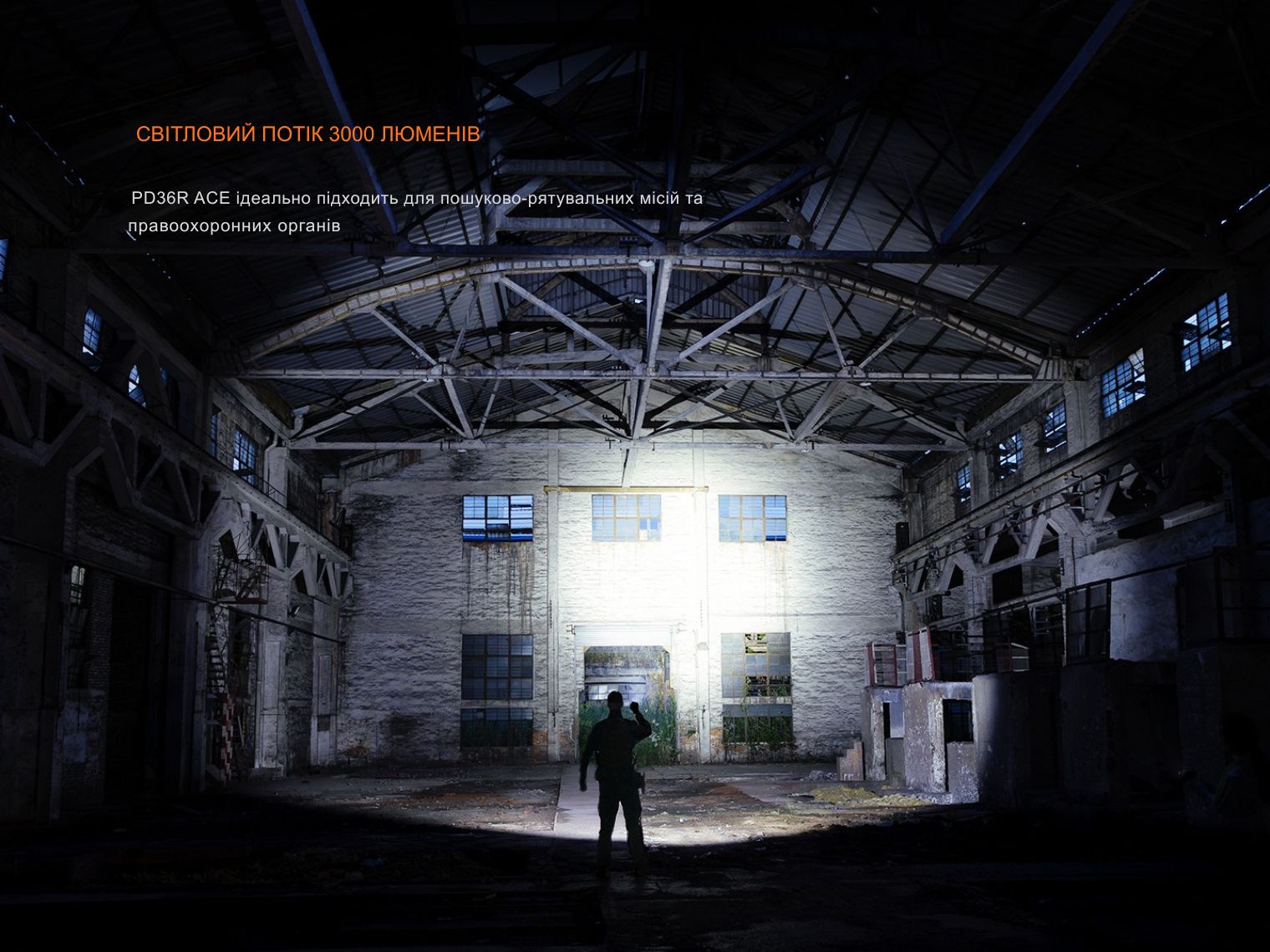 Тактичний ліхтар нового покоління Fenix PD36R ACE укомплектований світлодіодом Luminus SFT70 Gen2 під загартованою скляною лінзою з просвітлюючим покриттям. Модель генерує надʼяскравий світловий потік до 3000 люменів. Дальність променя сягає 415 м, що в поєднанні з холодною білою колірною температурою 6500K дає якісне та контрастне підсвічування великої області.
