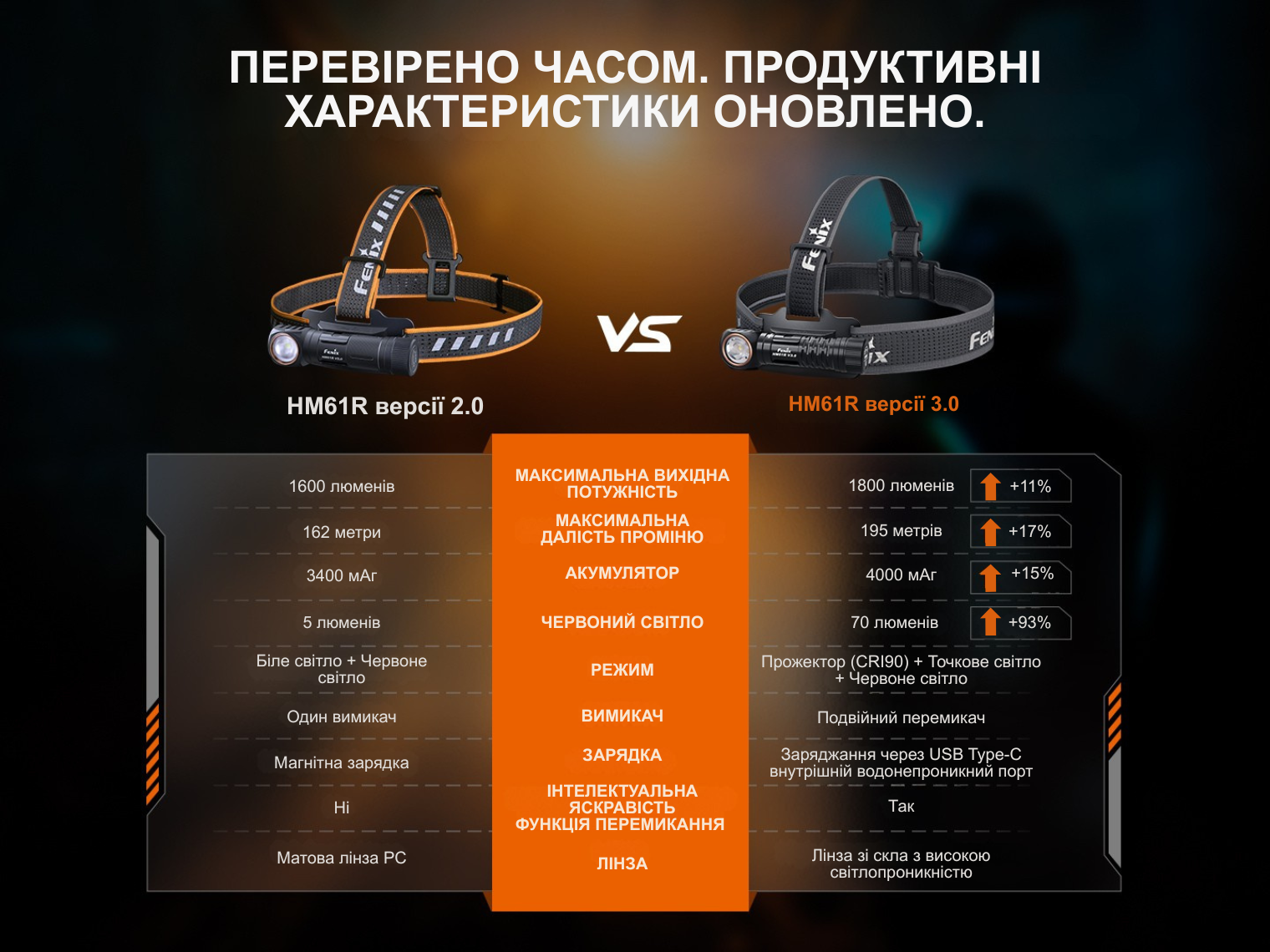Комплектація | Фонарь Fenix HM61R V3.0, аккумулятор ARB-L18-4000, налобное крепление (холдер и ремешок), зарядный кабель USB Type-C, запасное уплотнительное кольцо, инструкция |