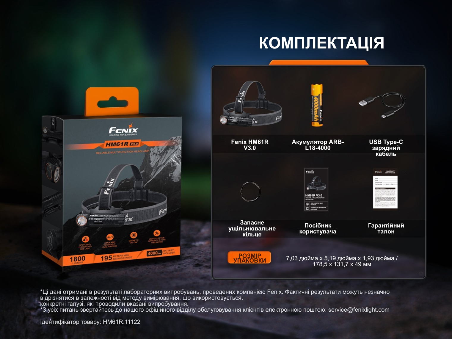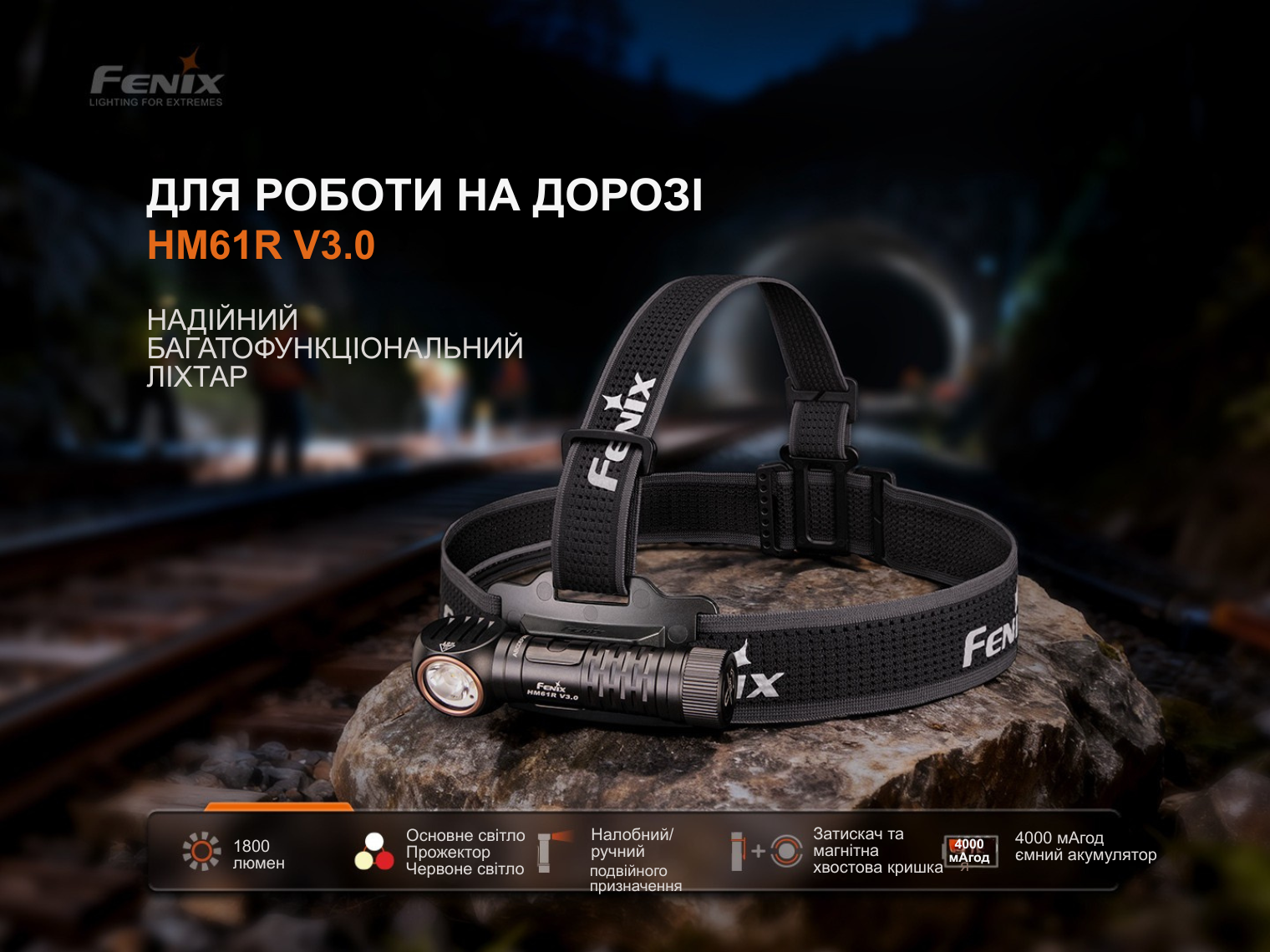 Ліхтар Fenix HM61R V3.0, акумулятор ARB-L18-4000, наголовне кріплення (холдер та ремінець), зарядний кабель USB Type-C, запасне ущільнювальне кільце, інструкція користувача, гарантійний талон.